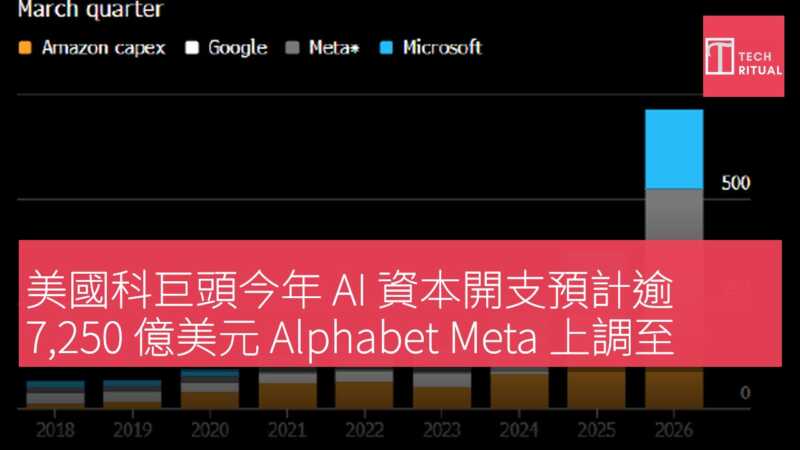 美國頂尖科技企業現正計劃今年資本開支高達 7250 億美元,主要投向 AI 數據中心設備。Google 母公司 Alphabet 及 Meta 雙雙上調全年資本開支預測;Microsoft首次給出截至 12 月底全年開支預估,與 Alphabet 持平,均為 1900 億美元。