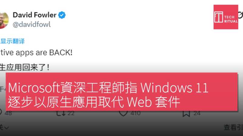 Microsoft資深工程師 David Fowler 在社交平台發文指「原生應用回來了(Native apps are back)」,顯示 Windows 11 正逐步將應用替換為原生實現。這是繼今年早前Microsoft Store 及檔案資源管理器架構師 Rudy Huyn 確認「Microsoft計劃為 Windows 11 建立 100% 原生應用」後,又一位資深工程師釋放的相同信號。Fowler 在Microsoft任職逾十年,深度參與 .