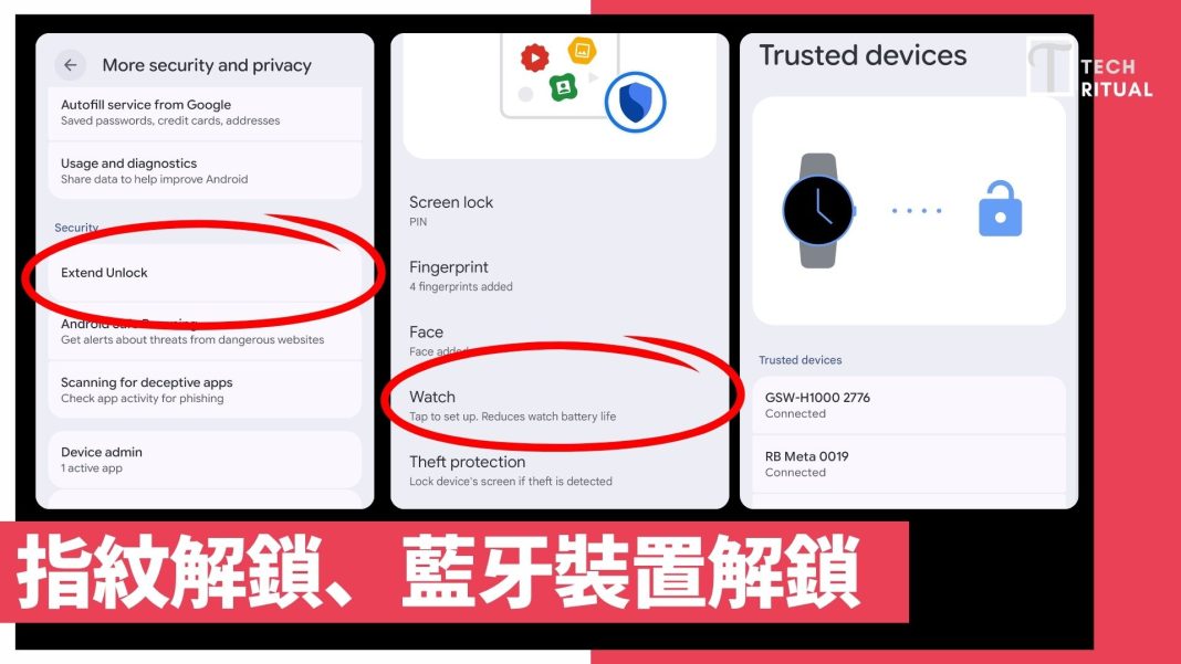 至於更常用,但很多人忽略的則是「藍牙裝置等延長解鎖」,下滑至「更多安全性和私隱設定」,然後選擇「延長解鎖」,這裡可以選擇加入不同的藍牙裝置,例如智能手環、智能手錶等等。只要做好選擇,選擇了便可以在連上這些藍牙裝置後,免除常常解鎖的煩惱。